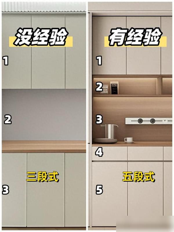 装修过的人都懂,全屋定制真是“看着简单,踩坑要命”——花了十万块装的柜子,入住没俩月要么抽屉蹲在地上翻半天,要么柜门变形翘成“波浪板”,要么每天撞拉手撞得腿青,那心情比吃了苍蝇还堵!我见过太多朋友踩过这些坑:同事小夏家之前装的三段式橱柜,中间留了一大片空白墙,挂个微波炉都没地方,咖啡机只能堆在台面,看着乱得要命;后来听劝改成五段式,吊柜装调料,开放格放咖啡机和面包机,木色墙面贴满孩子的冰箱贴,瞬间有了烟火气,现在她每天早上在那里做咖啡,都说“这才像个家”。