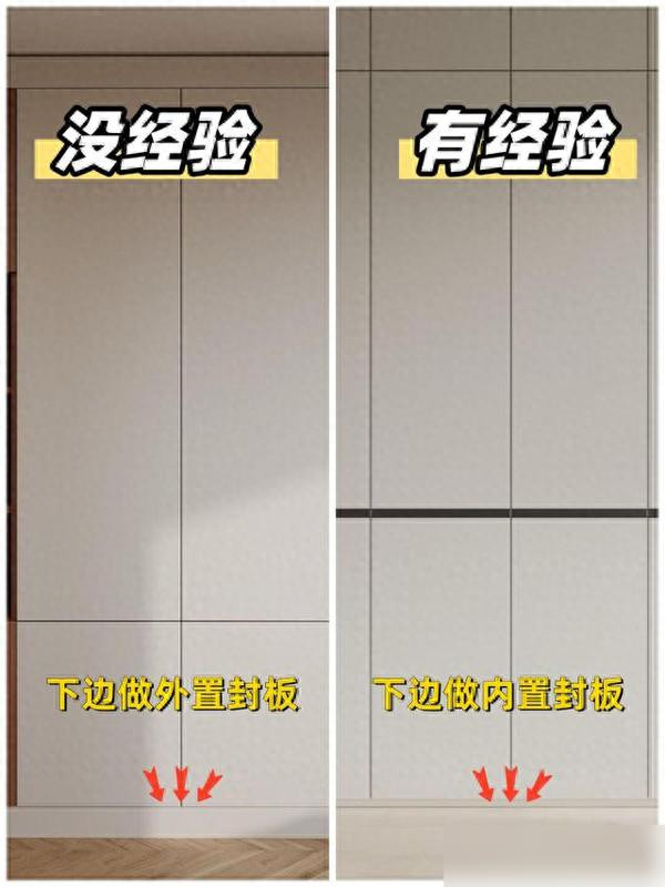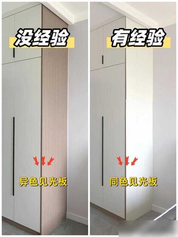 还有那些“颜值坑”:之前看邻居家柜子底部留个外置封板,像穿了个“增高鞋”,丑就算了,还藏灰尘,扫地机器人都钻不进去;现在自己家做内置封板,地面和柜体齐平,机器人直接钻进去打扫,省了好多功夫。见光板更要注意——朋友家之前柜子侧面用了不同色见光板,像“打了块补丁”,拍照都不敢拍侧面,后来重新做了同色见光板,整体感一下子上来,她现在总说“这柜子终于配得上我家的装修了”!